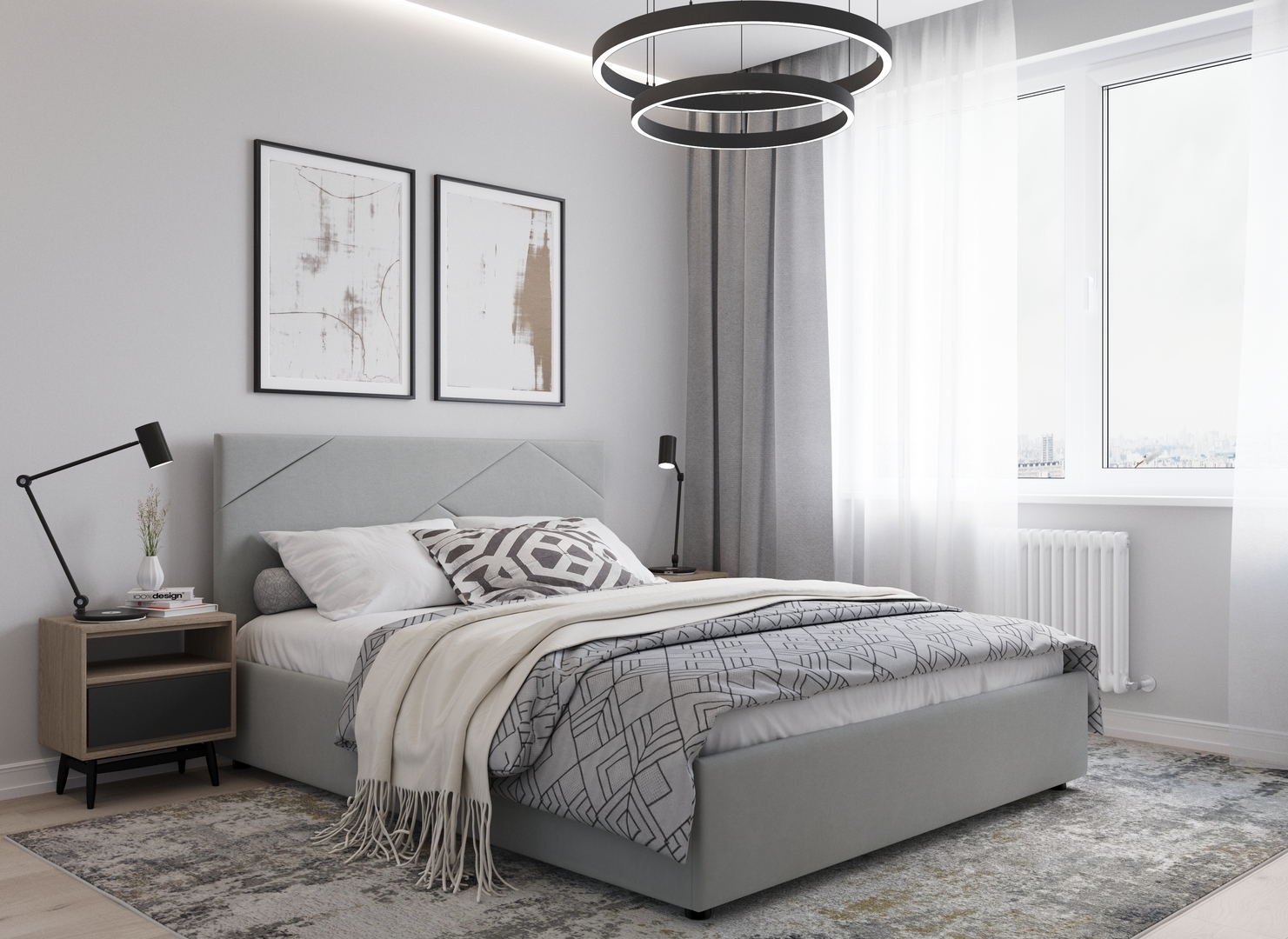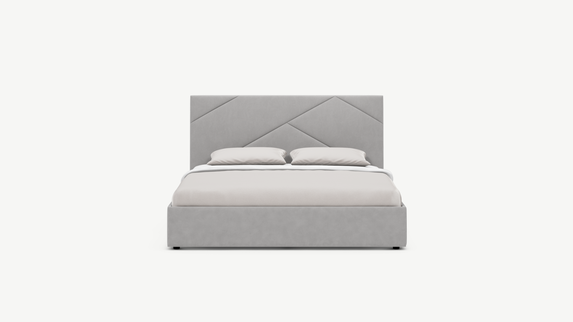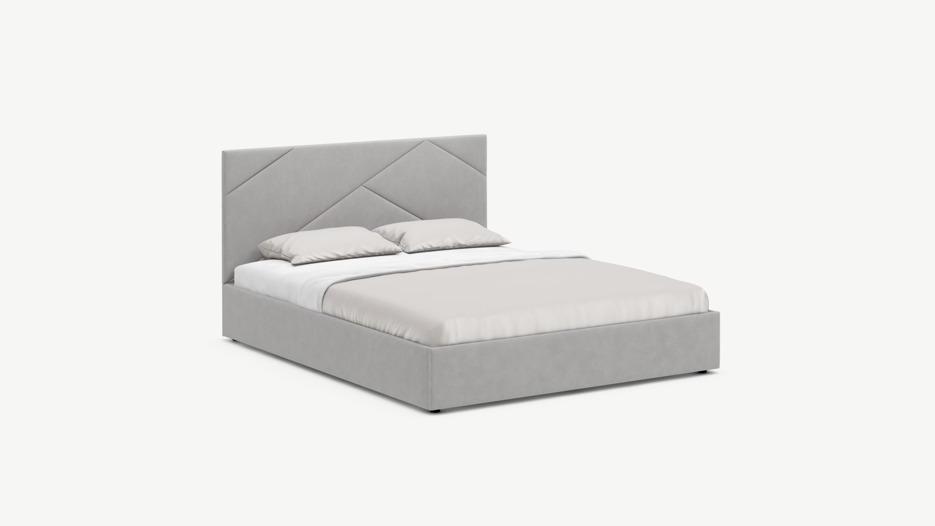 MOON FAMILY 1257 привлекает внимание оригинальным исполнением: широкие полосы ткани эффектно пересекают периметр изголовья, создавая на нем графический орнамент. Элегантным и практичным акцентом служат скрытые карманы, расположенные по его углам. Лаконичные формы объемных царг создают единый гармоничный образ и фокусируют внимание на центральном текстурном элементе кровати.