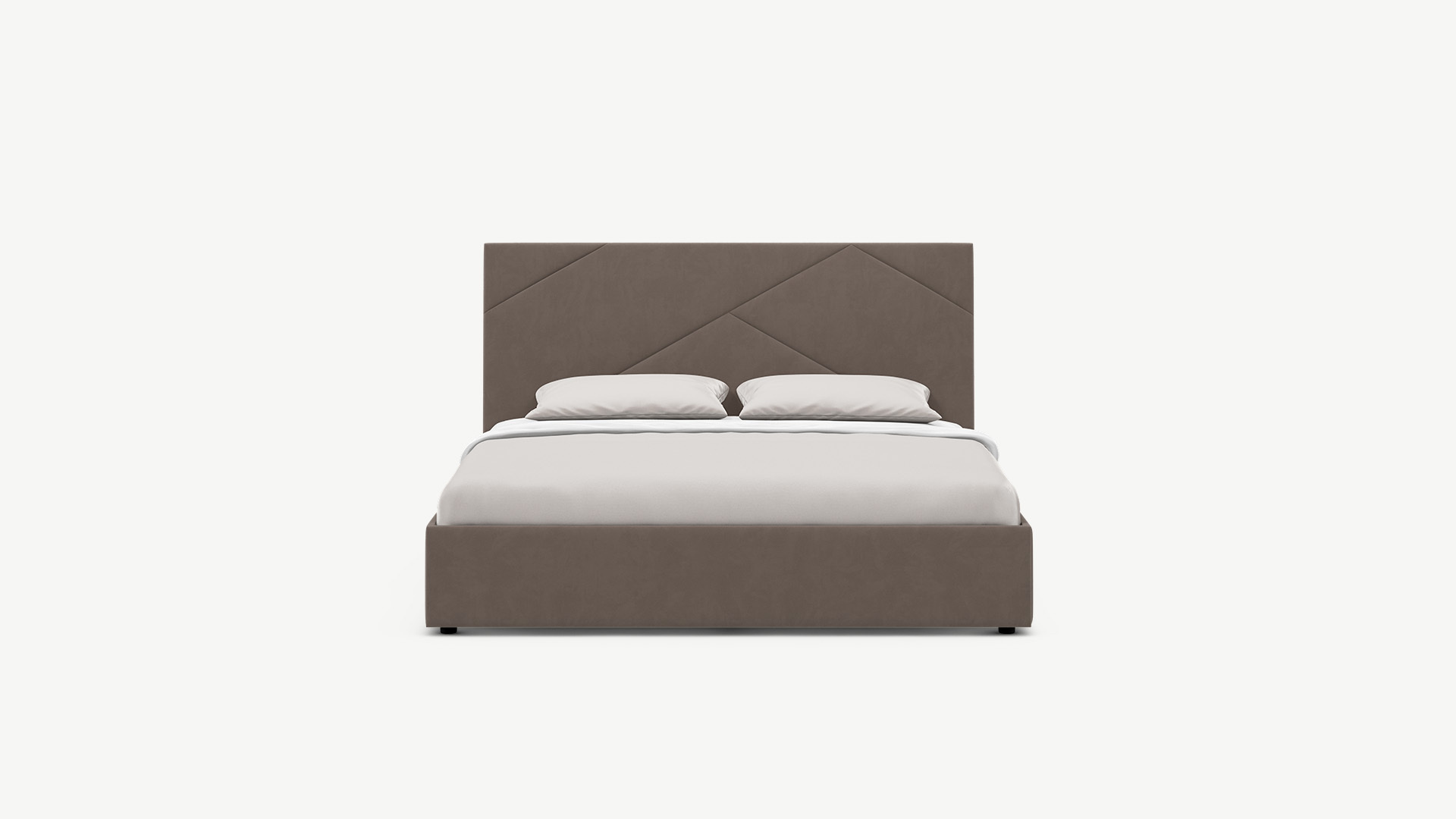MOON FAMILY 1257 привлекает внимание оригинальным исполнением: широкие полосы ткани эффектно пересекают периметр изголовья, создавая на нем графический орнамент. Элегантным и практичным акцентом служат скрытые карманы, расположенные по его углам. Лаконичные формы объемных царг создают единый гармоничный образ и фокусируют внимание на центральном текстурном элементе кровати.