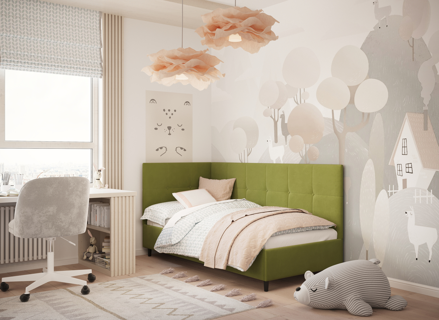 Угловая односпальная кровать MOON FAMILY 1261 с мягкой спинкой и изголовьем создаст в Вашей спальне ощущение уюта. Крупная квадратная стежка привносит в интерьер графических акцентов, а вставка из пуговиц наполняет пространство ощущением домашнего тепла.