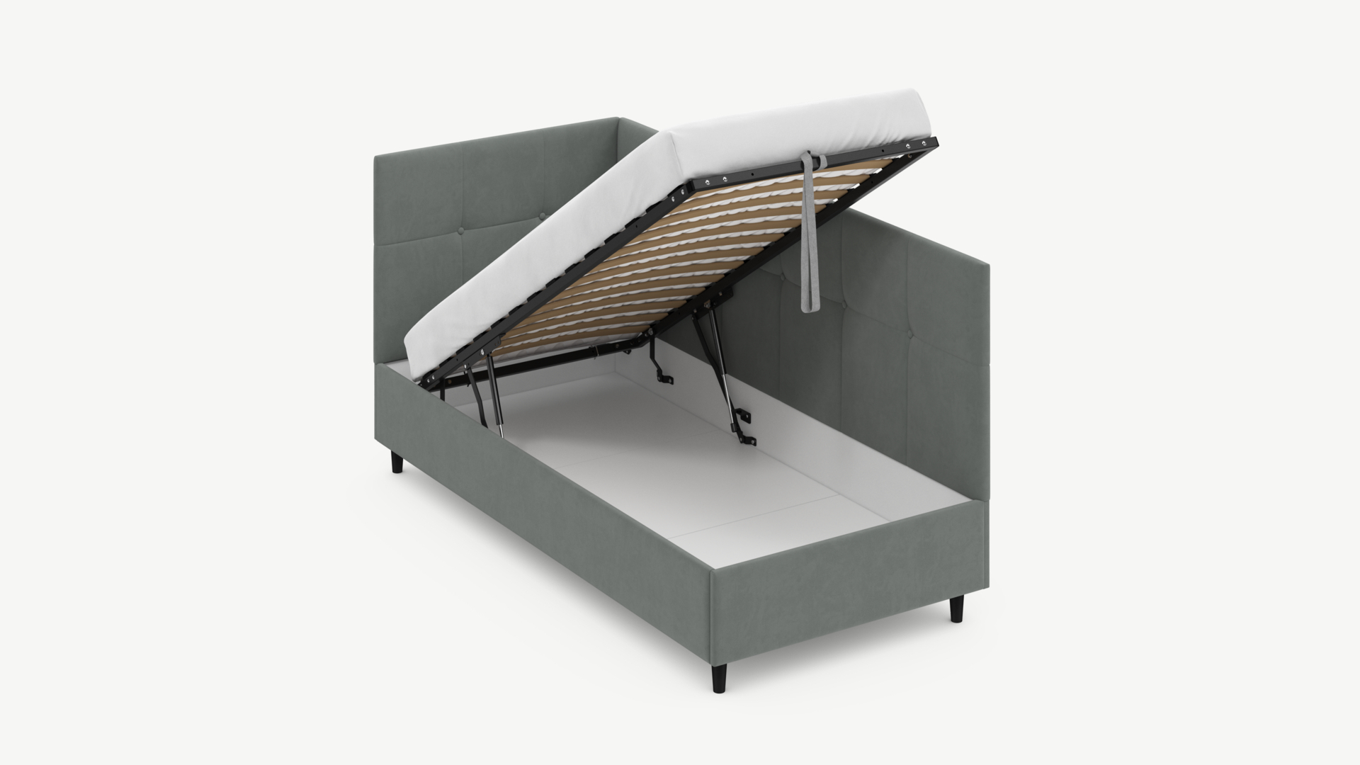 Угловая односпальная кровать MOON FAMILY 1261 с мягкой спинкой и изголовьем создаст в Вашей спальне ощущение уюта. Крупная квадратная стежка привносит в интерьер графических акцентов, а вставка из пуговиц наполняет пространство ощущением домашнего тепла.